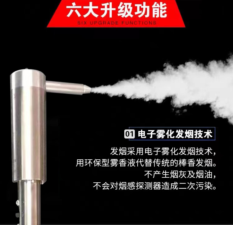 加烟器采用特制的雾香液与电子雾化技术,发出的烟雾有各种香味且绿色环保,无毒无害。根据火灾探测器倒挂在棚顶上的状况,为避免加烟后烟雾长时间滞留在火灾探测器迷宫内,特制雾香液雾化成烟后的比重大于空气比重,加烟试验后能短时间内在迷宫内快速消失,有利于提高试验工作效率减少反复报警。电子雾化发烟技术取代了传统的香棒加烟方式或气溶胶烟雾测试仪,不仅加烟方式有了进一步的升华而且烟雾中不含烟尘烟油,可避免棒香加烟所产生的烟尘烟油对火灾探测器造成二次污染。同时由于该产品采用了内部雾香液循环技术,降低雾香液的自然损耗,延长了雾香液使用时间,耗材使用成本随之减少。100ml雾香液可以检测5万只烟感。